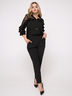 Оригинальный комбинезон-трансформер при помощи молнии разделяется на брюки и блузу. Верх изделия застегивается на декоративные пуговки по переду. Кокетку украшает сетка, окантованная рюшами. Манжеты рукавов на резинке. Имеются два накладных кармана. Брюки прямого кроя с защипами от линии талии, сзади оформлены резинкой. Предусмотрены два косых кармана.