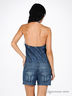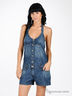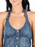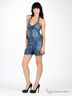 Комбинезон выполнен из джинсовой ткани. Бретелька застегивается вокруг шеи, регулируется по длине. Спинка присборена резинкой. Спереди втачные карманы, сзади накладные.