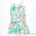 Детали: регулируемые бретели, по заниженному уровню талии пришиты шлевки, вставлена резинка, вставлен поясок, два передних кармана, складки, оборка по верхнему краю полочки, принты