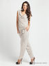 Детали: воротник хомут горловины, отрезной пояс на кулиске с лентой, два прорезных кармана спереди, свободные слегка зауженные книзу брючины.