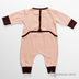 Округлый вырез горловины, застежка и пояс сзади, манжеты рукавов и штанин отделаны трикотажной резинкой. Застежка сзади на клепки. Полочка цельнокройная и сшита со спинкой шаговым и боковыми швами.
