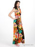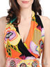Детали: V-образный вырез с запахом; втачной пояс сзади посажен на многорядную резинку, спереди дополнен декоративными элементами с пайетками и бусинами; штанины с запахом; завязывается на пояс на талии и через шею; декорирован оригинальным принтом; застегивается на молнию сзади