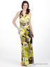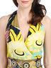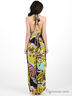 Детали: V-образный вырез с запахом; втачной пояс сзади посажен на многорядную резинку, спереди дополнен декоративными элементами с пайетками и бусинами; штанины с запахом; завязывается на пояс на талии и через шею; декорирован оригинальным принтом; застегивается на молнию сзади