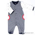 Комбинезон в темно-синюю мелкую полоскуна кнопках, украшенный цветными вставками по бокам.