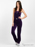 Элегантный комбинезон выполнен из плотного, мягкого микровелюра. Вырез горловины - каре. Широкие лямки. Верх полочки и спинки собран на резинку. Отрезной пояс на резинке. Полочка и пояс декорированы стразами. Сзади два накладных кармана. Длинные зауженные брючины.