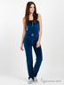 Элегантный комбинезон выполнен из плотного, мягкого микровелюра. Вырез горловины - каре. Широкие лямки. Верх полочки и спинки собран на резинку. Отрезной пояс на резинке. Полочка и пояс декорированы стразами. Сзади два накладных кармана. Длинные зауженные брючины.