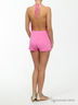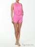 Свободный трикотажный комбинезон с шортами и резинкой на поясе. На груди оформлен драпировкой. Открытая спина, с тонкими завязками - шнурками на шее. Глубокие удобные карманы в боковых швах.