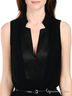 Детали: воротник стойка, спереди вырез на молнии, без рукавов, сзади два прорезных кармана, талия подчеркнута ремнем