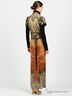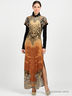 Изящный комплект из длинного платья и болеро. Платье выполнено из тонкого, мягкого, приятного на ощупь трикотажа с эффектным принтом. Воротник- стойка. Короткие цельнокроеные рукава с манжетами. Боковой шов дополнен большим разрезом. Талия подчеркивается с помощью пришитых лент, завязывающихся на спине. Болеро выполнено из тонкого, приятного на ощупь трикотажа. Воротник-гольф. Длинные рукава собирающиеся на запястье оригинальными складками. Фигурная нижняя часть. Болеро рекомендуется одевать под платье.