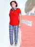 Комплект состоит из двух предметов: кофта и брюки. Кофта с короткими рукавами и отложным воротником. Модель выполнена в яркой, контрастной расцветке. Брюки прямого кроя на эластичном поясе. Отличный вариант на каждый день.