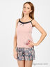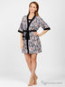 Комплект состоит из халата, топа и шорт. Выполнен из тонкого трикотажа средней эластичности, шорты и халат декорированы рисунком. Халат на поясе с коротким рукавом и одним накладным карманом. Топ с контрастной окантовкой декорирован кружевной тесьмой и принтом. Шорты на резинке.