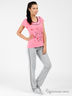 Комплект домашней одежды состоит из двух предметов, футболки и штанов. Футболка прямого кроя, короткие рукава, округлый вырез горловины, застежка на кнопки, полочка изделия украшена принтом. Брюки прямого кроя с широкой эластичной резинкой в поясе. Качественные вещи из натурального, приятного на ощупь материала.