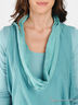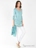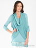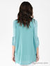 Детали: округлый вырез горловины, длинный прямой рукав присборен на хлястик с перламутровой пуговицей, низ изделия декорирован кружевом, джемпер с воротом-хомутом, два кармана, фигурный крой полочки с запахом.