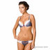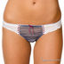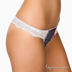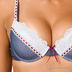 Стильный комплект джинсового цвета. Бюстгальтер пуш -ап (формованная чашка со съемными бретелями) с белой ажурной вставкой и с прошитой сиреневой ленточкой. Между чашечками пришит привлекательный бантик. Бюстгальтер с оригинальными двойными бретелями впереди. Трусики стринг с широким ажурным поясом и вставками вперди.