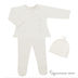 Замечательный комплект из кофточки с V-образным вырезом с застежкой на пуговичке сзади, ползунков с ножками на эластичной резинке и шапочки будет не заменим в первые месяцы малыша.