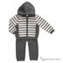 Кофта с капюшоном и длинными рукавами имеет центральную застежку на молнию. Модель оформлена контрастными вставками. Низ изделия и манжеты рукавов и брючин окантованы в рубчик. Брюки на широком эластичном поясе.