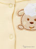 Комбинезон с длинным рукавом застегивается на кнопки от выреза горловины, застежка расходится в две стороны по шаговому шву и спускается до формованной стопы. Полочка украшена нашивкой.