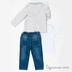 Комплект для мальчика состоит из пиджака, футболки и джинс. Пиджак с отложным воротом и лацканами застегивается на пуговицы. Футболка с круглым вырезом и коротким рукавом декорирована аппликацией на полочке. Джинсы с отрезным поясом на пуговице и четырьмя карманами.