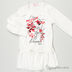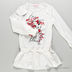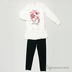 Комплект состоит из туники и лосин. Выполнен из мягкого эластичного материала. Туника с манжетами и втачным поясом в виде трикотажной резинки. Декорирована оригинальными аппликациями и стразами. Лосины черного цвета посажены на резинку.