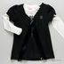 Комплект состоит из лонгслива и кардигана. Лонгслив с воротом-стойкой декорирован оригинальной аппликацией. Кардиган имеет форму "распашонки", в качестве застежки используется атласная лента, которая завязывается в красивый бант, рукав фонарик.
