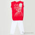 Комплект состоит из футболки и лосин. Футболка из плотного трикотажа украшена оригинальным принтом, подол посажен на широкую резинку с небольшой сборкой по бокам, по вырезу рукавов завернутая трикотажная резинка, классические лосины на резинку из мягкого трикотажа.