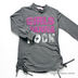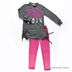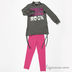 Комплект состоит из тунички и лосин. Туника серого цвета, рукав на манжете, воротник стойка, На боковых швах вертикальные кулиски. Лосины розового цвета посажены на резинку.