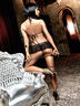 Никогда еще не был соблазн таким притягивающим. Неотразимый комплект из черного кружева с золотистым цветочным орнаментом. Бюстгальтер-треугольник с тонкими регулируемыми завязками за шеей раскрывает Вашу светскую сторону. Юбочка с черными рюшами из тюлевой ткани распыляет романтику.