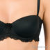 Бюстгальтер балконет на косточках с эффектом push-up с поролоновым уплотнителем. Бесшовные чашечки. Бретели съемные, регулируются по длине. Застежка на два крючка. Задняя часть бюстгалтера по краям посаженна на резинки с силиконовой прокладкой. Выполнен из шелковистого эластичного материала. Украшен кружевом.