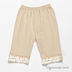 Брюки прямого кроя. В пояс вставлена резинка. Низ брючин украшен рюшами.