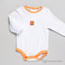 Классическое боди прямого кроя с длинным рукавом застегивается на две пуговицы на спинке и классическую боди-застежку на кнопках. Нашивка на полочке.