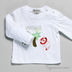 Футболка с длинным рукавом застегивается на две кнопки на левом плечике. Полочка украшена вышивкой и нашивками.