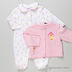 Летний комплект из приятного на ощупь материала. Распашонка с круглым вырезом на кнопках и с длинными рукавами. Комбинезон с отложным воротом, длинными рукавами, спереди застегивается на кнопки. Оригинальный принт "цыплята".