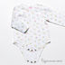 Весенне-летний комплект: брюки с карманами на резинке, кофта с длинными рукавами с оригинальным принтом, боди нежного цвета в цветочек, куртка с отложным воротником, на пуговицах и с карманом.