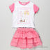 Яркий летний комплект состоит из: футболки с круглым вырезом, короткими рукавами, сзади застегивается на пуговицы, полочка украшена оригинальным принтом. Юбочка с многослойными рюшами на резинке.