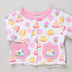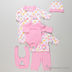 Повседневный нежный комплект состоит из 6 вещей: слюнявчик с рисунками на кнопке, боди с круглым вырезом и длинными рукавами, брюки на широкой резинке, распашонка на кнопках с накладным кармашком, ползунки с отложным воротником на кнопках, шапочка с ярким принтом.