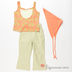 Повседневный комплект из гладкого материала. Топ на тонких бретельках, полочка украшена многослойными рюшами. Брюки на широкой резинке, спереди 2 прорезных кармана. Косынка на тонких лямках.