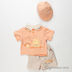 Нежный летний комплект состоит из: футболки-поло с отложным воротом, короткие рукава, спереди застегивается на пуговицы, на полочке оригинальные нашивки и вышивка. Шортики на поясе-резинке, спереди 2 втачных кармашка, сбоку накладной карман. Украшены вышивкой "машинки". Шапочка с принтом в полоску.