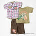 Детали: круглый вырез горловины, трикотажная бейка по вырезу, короткие рукава, стильный принт на полочке, шорты с трикотажной резинкой поясом, шлевки для ремня, два накладных кармашка, стильный принт на брючине, рубашка с отложным воротником на небольшой стойке, короткие рукава, накладной кармашек с клапаном на пуговице, стильный принт на полочке