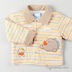 Трикотажная кофта прямого силуэта утеплена флисовым подкладом и застегивается на кнопки. Отложной вельветовый ворот. Длинный рукав с вельветовым отворотом. Полочка декорирована нашивками и вышивкой.