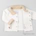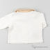 Трикотажная кофта прямого силуэта с отложным воротом застегивается на кнопки. Длинный рукав с декоративным отворотом. Полочка декорирована нашивками и вышивкой. Маленький нагрудный кармашек.