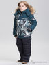 Куртка на искусственном пуху прямого силуэта. Центральная застежка на открытую тесьму-молнию, с нижней ветрозащитной планкой. Воротник стойка. Рукав втачной, Манжеты рукавов и низ куртки выполнен из трикотажа. На нижней части переда боковые прорезные карманы на молнии. Датчик контроля температуры. Брюки –полукомбинезон с регулируемыми по длине бретелями. Верхняя часть брюк застегивается на молнию. В верхней части брюк два врезных кармана. Пояс притачной с резинкой. Низ брюк с отворотной манжетой, регулируемой по длине и ширине и со снегозащитной муфтой. Принты на передней части куртки.