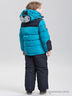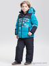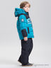 Куртка прямого силуэта. Центральная застежка на тесьму-молнию, с внутренней ветрозащитной планкой. Воротник стойка. Рукав втачной, регулируемый по длине отворотными манжетами внутренними ветрозащитными трикотажными напульсник. На нижней части переда боковые прорезные карманы закрытые листочками. Капюшон “шлем”с отстегивающимися очками. Имеется кулиса для регулировки объема. Датчик контроля температуры. Брюки –полукомбинезон с регулируемыми по длине бретелями. Верхняя часть брюк застегивается на молнию. В верхней части брюк два врезных кармана. Пояс притачной с резинкой. Низ брюк с отворотной манжетой, регулируемой по длине и ширине и со снегозащитной муфтой. Принты и нашивки на передней части куртки. Капюшон “шлем”с отстегивающимися очками.