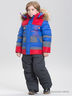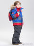 Куртка прямого силуэта. Центральная застежка на тесьму-молнию, с наружней втачной ветрозащитной планкой. Воротник стойка. Рукав втачной, регулируемый по длине отворотными манжетами внутренними ветрозащитными трикотажными напульсниками. На нижней части переда боковые прорезные карманы. Капюшон съемный на молнии. Имеется кулиса для регулировки объема. Датчик контроля температуры. Брюки –полукомбинезон с регулируемыми по длине бретелями. Верхняя часть брюк застегивается на молнию. В верхней части брюк два врезных кармана. Пояс притачной с резинкой. Низ брюк с отворотной манжетой, регулируемой по длине и ширине и со снегозащитной муфтой. Принты на передней части куртки. Нашивки на рукаве и куртке. Детский рюкзачок.
