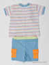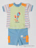 Детали: округлый вырез горловины, застежка на кнопки на спине, короткий прямой рукав; шорты на плотной резинке с двумя накладными карманами