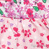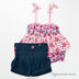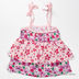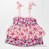 Блузка свободного кроя завязывается на тканные ленты бантом на плечах. В верх лифа вшита резинка, сажающая изделие по фигуре. На юбку нашита широкая оборка из ткани контрасного узора и расцветки.