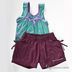 Короткие шорты на резинке и топ А-силуэта, на широких лямках, украшен принтом и пайетками.