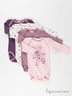 Комплект из четырех боди для девочки. Выполнен из тонкого эластичного трикотажа. Круглый вырез горловины, длинный рукав, застежка на кнопки в пройме. Боди темно-сиреневого цвета декорировано контрастной окантовкой и принтом на полочке. Боди белого цвета с оригинальным рисунком. Однотонное боди лилового цвета. Боди розовое с принтом на полочке.