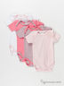 Комплект из четырех боди для девочки. Выполнен из тонкого эластичного трикотажа. Округлый вырез горловины, короткий рукав, застежка на кнопки в пройме. В комплекте белое, ярко-розовое и сиреневое боди, декорированные принтом и контрастной окантовкой и светло-розовое однотонное боди.
