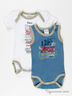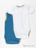 Комплект из двух боди для мальчика. Выполнен из тонкого эластичного трикотажа. Белое боди с коротким рукавом и округлым вырезом горловины. Синее боди на бретелях. Застежка в пройме на кнопки, декорированы принтом на полочке и контрастной окантовкой.