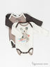 Комплект состоит из двух боди, выполненных из тонкого эластичного трикотажа. Округлый вырез горловины, застежка на кнопки в пройме, длинный рукав, оригинальный принт на полочках. Края боди с контрастной окантовкой.